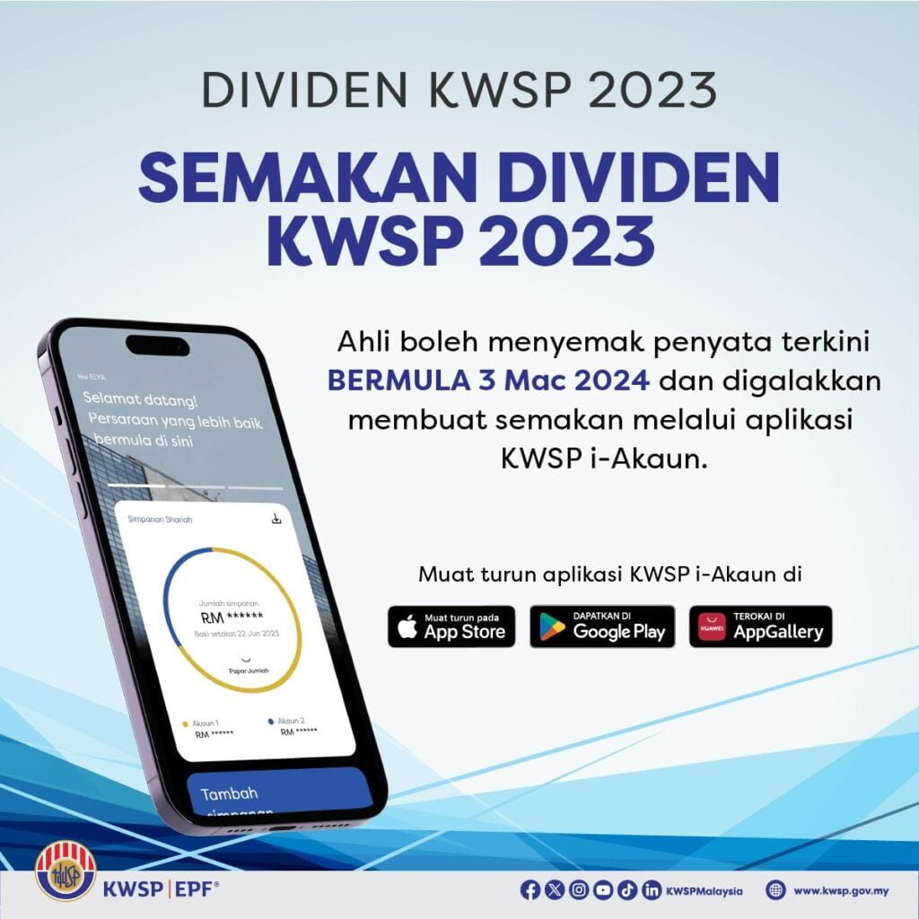 Kumpulan Wang Simpanan Pekerja (KWSP) mengumumkan kadar dividen 5.5 peratus bagi simpanan konvensional dan 5.4 peratus untuk simpanan syariah bagi tahun kewangan 2023.